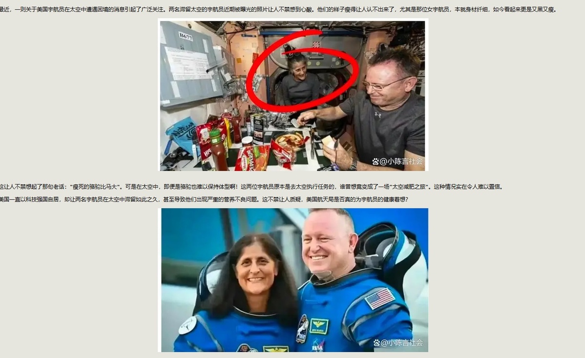 Широкое внимание общественности привлекла новость о трудностях, с которыми столкнулись американские астронавты в космосе. Недавно опубликованные фотографии двух астронавтов, застрявших в космосе, вызывают у людей грусть. Они выглядят настолько худыми, что их невозможно было узнать, особенно женщина-космонавт, которая и без того была стройной, но теперь выглядела еще темнее и тоньше...