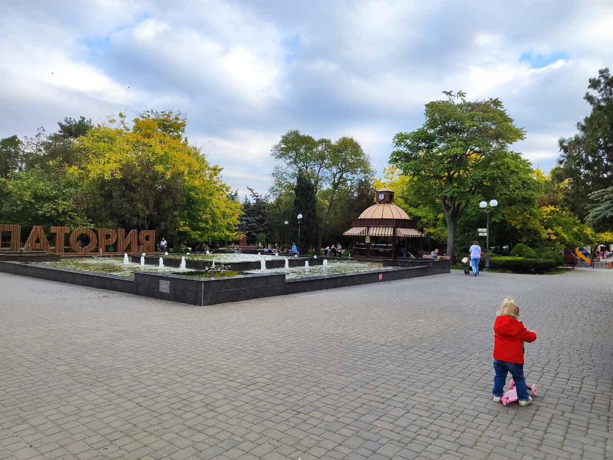 Купили кипарис в палисадник и, конечно же, пошли гулять по Евпатории. Обязательно к морю, как же иначе. В тот день еще и погода была хорошая, довольно тепло и минимум ветра. Вот так и живем, в Черноморском гуляем у моря и в Евпатории гуляем у моря. Хорошо! Сказка! Про кипарис тут: Я вам писала, что мы ездили в садовый центр. Раз уж приехали, почему бы не погулять заодно. В прошлый раз мы гуляли по отремонтированной набережной им. Терешковой, а сейчас пошли по старинке на набережную им. Горького. Всю не прошли, только частично по улице Дувановской и вышли к пляжу, сделали фотографии. Про новую набережную им. Терешковой тут: Шикарно цветут возле театра, где фонтан, хризантемы. Я просто залюбовалась. Надо же было посадить такую красоту! Где-то в этот момент мне захотелось поехать на бал хризантем в Никитский ботанический сад.) В этот раз впервые Мария покаталась на аттракционе паровозик. А точнее мы покатались вместе. Все же ей еще одной рано. Толковые фото не получились, правда.)