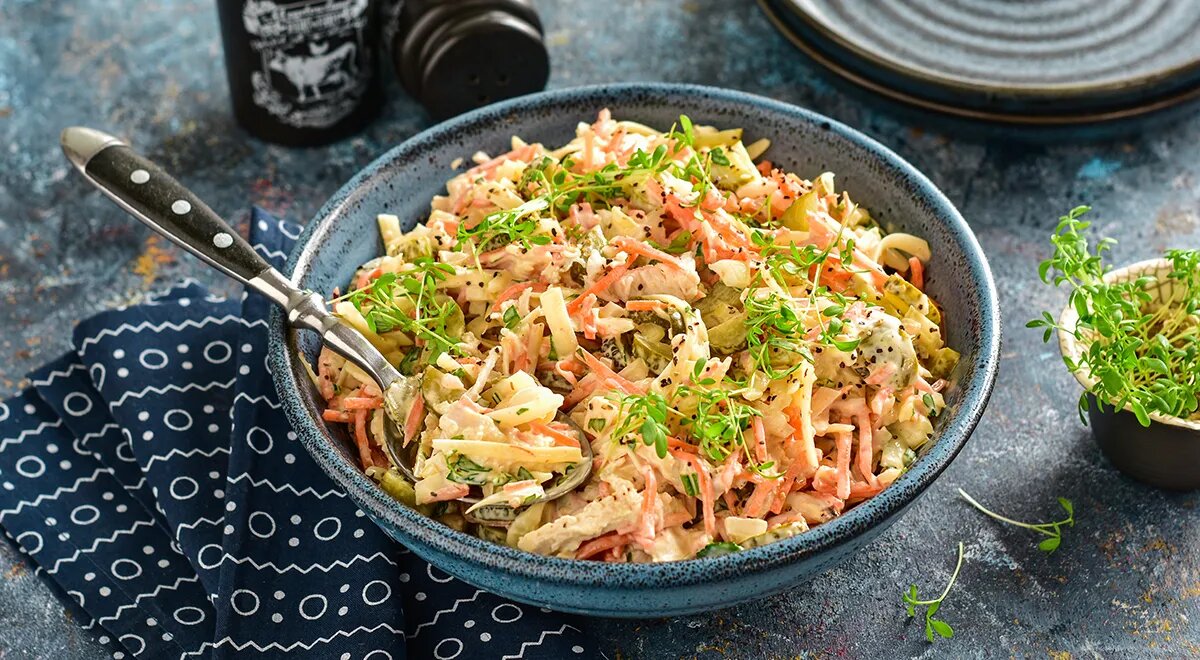Салат «Лисичка» с его насыщенным и оригинальным вкусом отлично подойдет как для обычного обеда, так и для праздничного застолья. Это пример вкусного и необычного блюда, которое не требует дорогих ингредиентов. Все необходимые продукты легко найти в ближайшем магазине, даже возвращаясь с работы. Поместите филе в небольшую кастрюлю, залейте горячей водой и доведите до кипения на плите. Слегка посолите и варите в течение 15 минут. Затем снимите с огня и оставьте остывать в бульоне. Очистите лук и нарежьте его как можно мельче. Положите лук в миску, залейте яблочным уксусом и перемешайте. Дайте ему промариноваться 10 минут. Мелко нарежьте листочки петрушки, отделенные от веточек. Огурцы нарежьте тонкими кружочками, затем разрежьте каждый кружок пополам. Корейскую морковь откиньте на сито, чтобы удалить лишний маринад, и нарежьте её на мелкие кусочки. Натрите сыр на крупной терке. Нарежьте куриное филе тонкими полосками и переложите в большую миску. Добавьте натертый сыр, замаринованный лук
