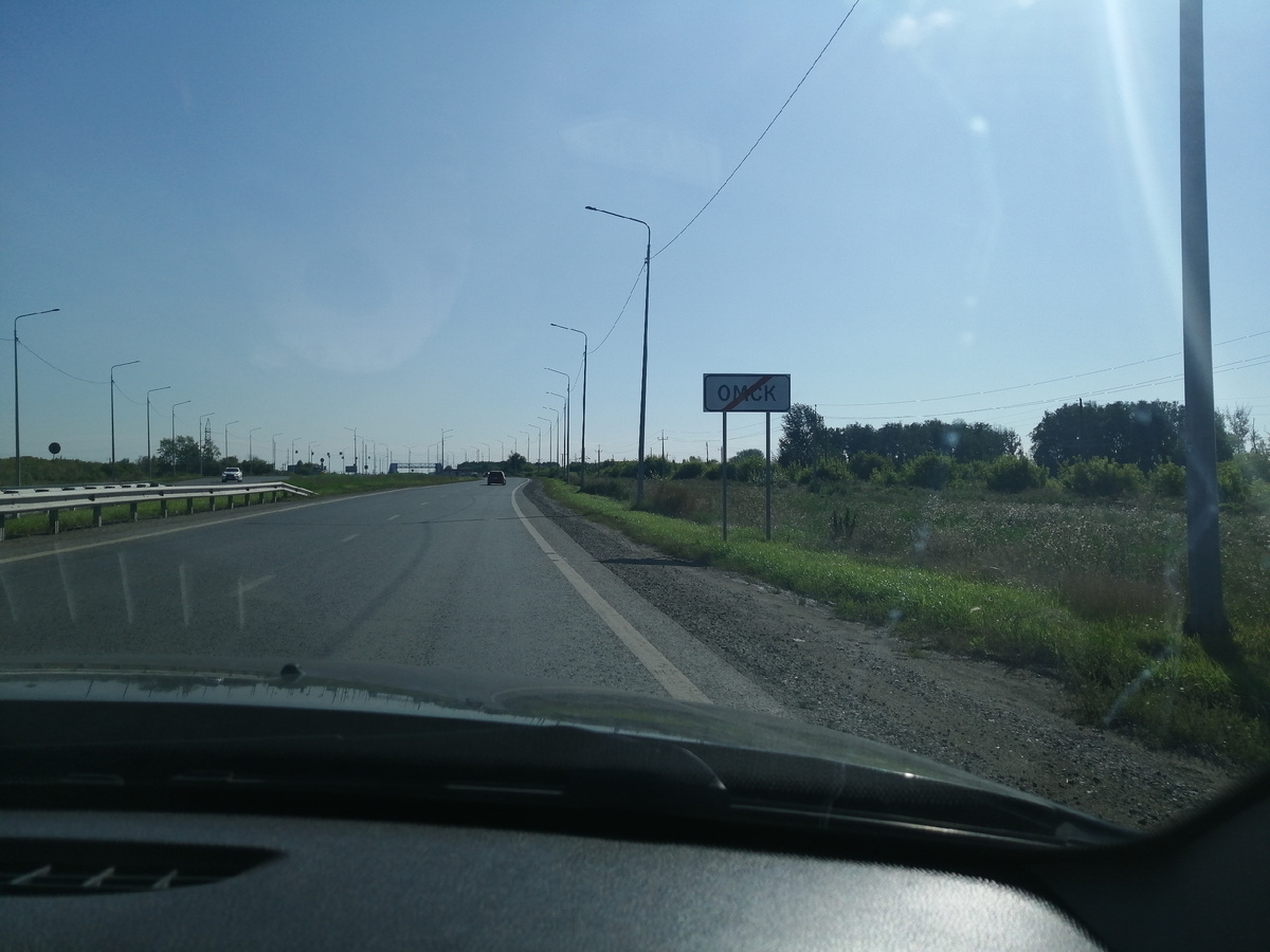 Выезжаем из Омска около 10 часов дня, движемся от Казани дальше – на Алтай. Выезжаем по Сыропятскому тракту, дорога от города идет четырехполосная: две полосы в одну сторону, и две в другую, но уже минут через десять четырехполосная дорога заканчивается, дальше - двухполосная. В 10.16 въезжаем в поселок Кормиловка и сразу поворачиваем налево. Можно проехать прямо и направо, но навигатор говорит, что налево быстрее на пять минут. Через железнодорожные пути в Кормиловке проезжаем сверху по мосту, не стоим на переезде, едем мимо заправки «Газпромнефть». Потратив на проезд по населенному пункту 10 минут, выезжаем на трассу. В 10.42 проезжаем через круговое движение у поворота на Калачинск – третий по величине город в Омской области, в 10.46 - еще одно круговое движение, налево дорога уходит на Калачинск, направо - на село Иртыш. В 10.50 - очередное круговое движение, поворот на поселок Оконешниково. В 11.17 въезжаем в Новосибирскую область. В 12.00 - поворот на деревню Минино, дейст