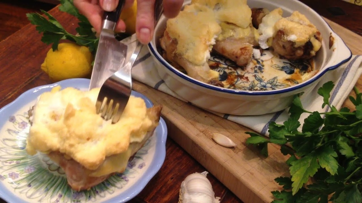 Ингредиенты: 1 средняя курица Для соуса: Для снега: Курицу разделать и запечь в духовке при температуре 250 градусов до готовности. Слить жир. Для приготовления соуса смешать сметану, толченый чеснок, горчицы, несколько капель сока лимона ( можно развести лимонную кислоту), соль и растертые яичные желтки. Залить курицу соусом. Приготовить снег: взбить белки, соль, 3-5 капель лимонного сока до белой пены. Выложить снег ложкой на курицу и запечь в духовке до образования румянца. Подавать готовую курицу к столу в той же посуде, в которой запекали. СОВЕТ: чтобы использовать всего 2 яйца, нужно сделать маленькую дырочку и вылить белок для снега, а желток оставить в скорлупе и сварить.