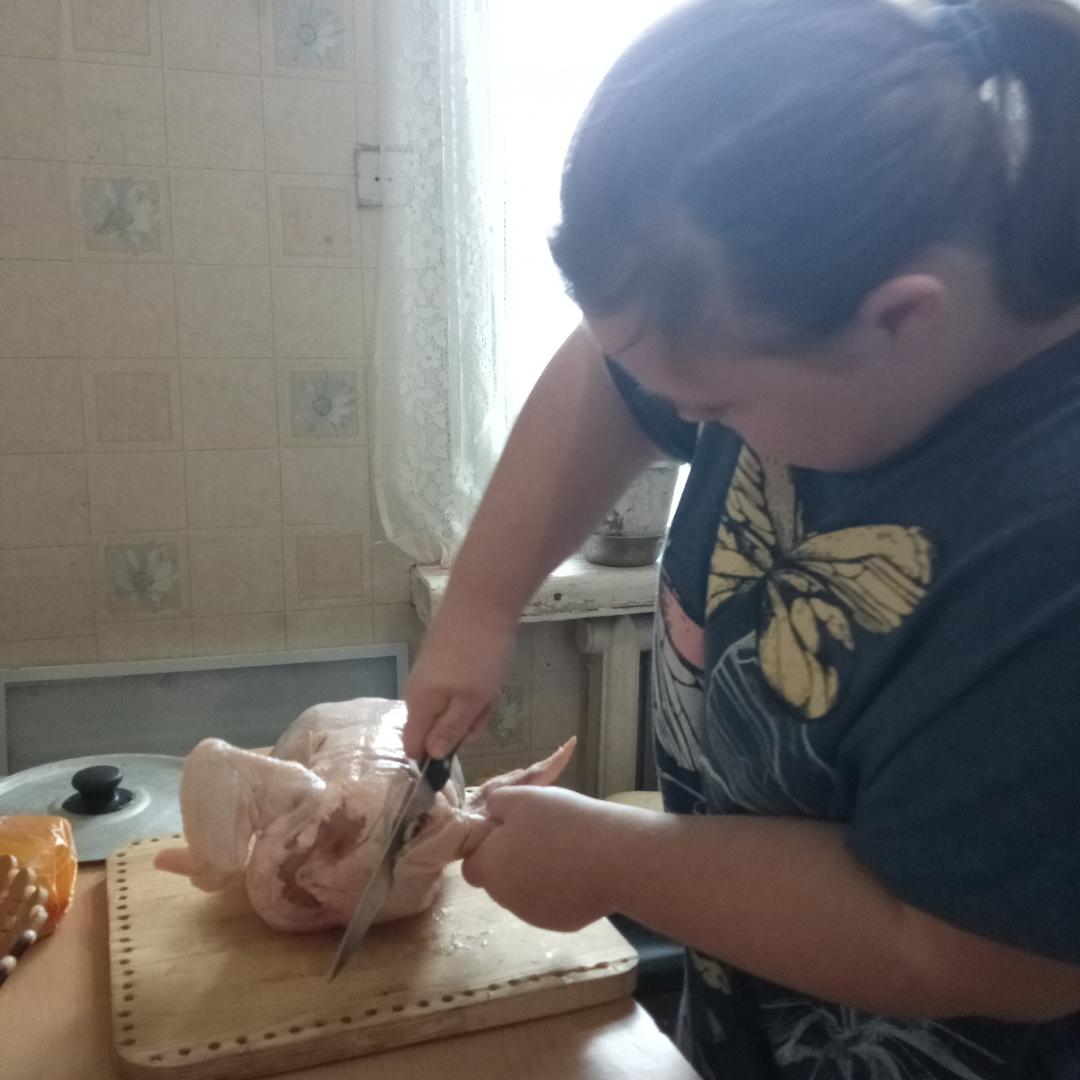 Однако вовремя я спохватилась и вышла из своего транса, ещё не всё Ирина успела позабыть. Сегодня она хозяйничала на кухне. Сначала решили что она будет готовить. Ирина вызвалась сварить суп и замариновать курочку чтоб потом пожарить. Проговорили что надо для супа, последовательность и как она будет мариновать (ингредиенты). Два раза напомнила ей про соль, почему-то Ирина, до сих пор, так и забывает про соль. Ну а дальше я присела рядом на стульчик со своими делами и дала Ирине полную волю. Ох уж эта курочка! Разделывать её не так уж и просто оказалось для Ирины Но девушка быстро вспомнила, что по косточкам нож не режет, надо резать по хрящикам. Курочку одолела! Часть положила вариться в суп, а часть замариновала Для маринада взяла: кетчуп, майонез, базилик и немного соли. Дальше дело за картошкой Начистила целую сеточку, ещё и на пожарить хватит. Натерла морковку на обжарку, правда с луком Ирина не дружит и попросила помочь ей порезать луковину Я заметила что она очень интересно реза