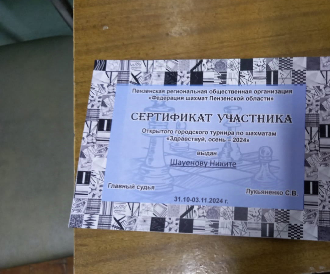 У Никиты сегодня закончился турнир по шахматам. Из 8 игр выиграл только 3. Призовое место конечно не получил, но сертификат об участии дали и вкусный презент.