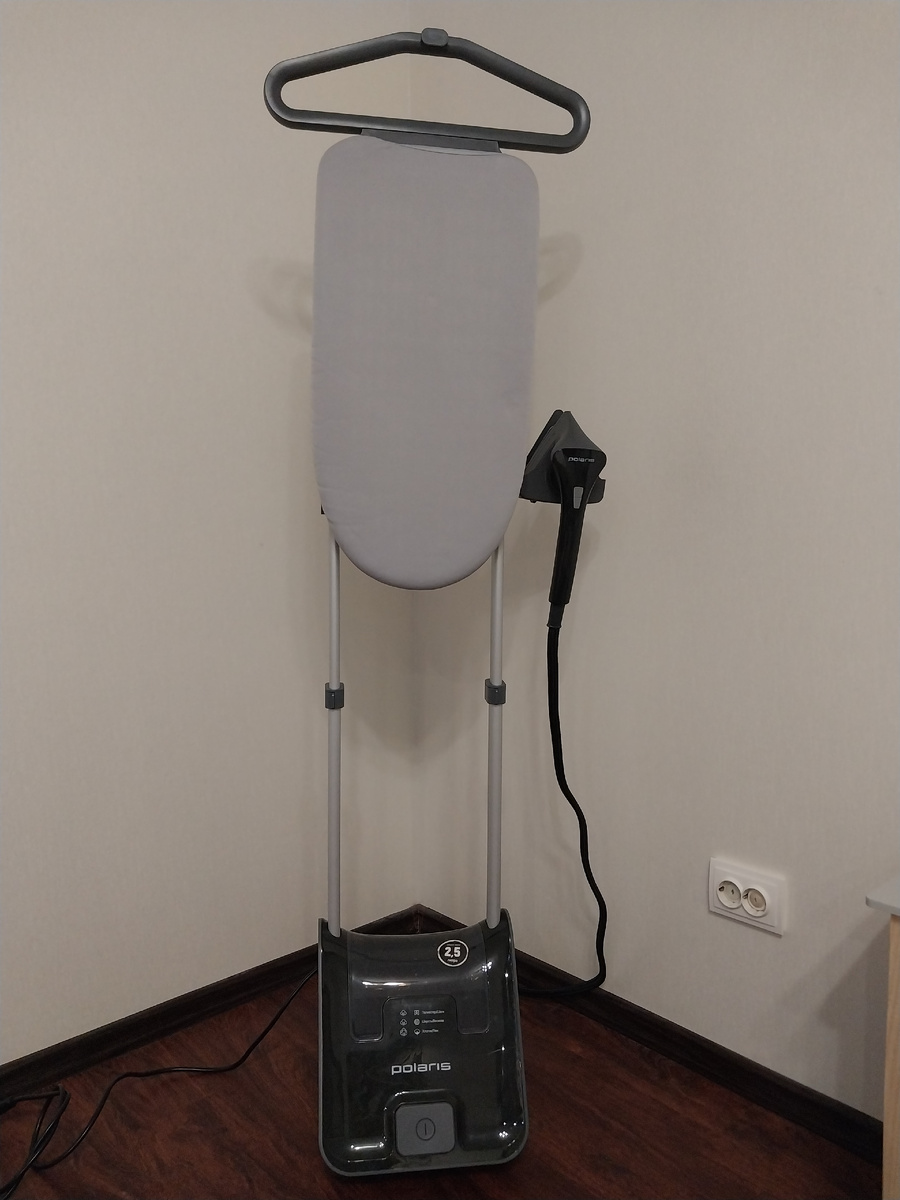 Плечики среднего размера, основание отпаривателя на колесах, поэтому можно спокойно отпаривать вещь, не перевешивая, просто обходить вокруг по мене необходимости.