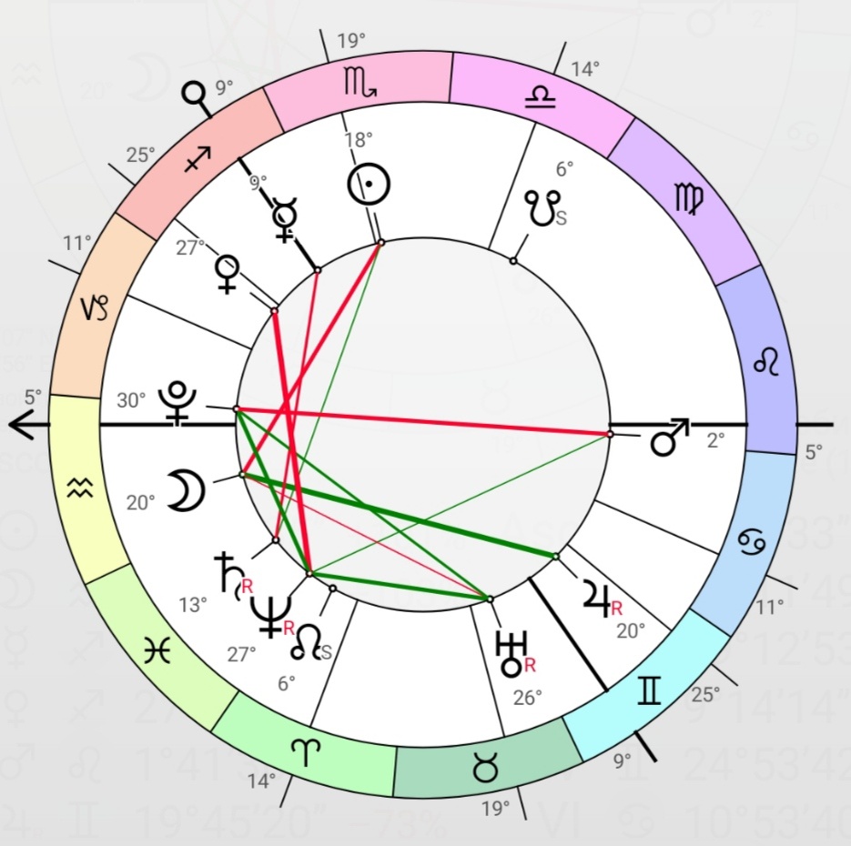 Сабианский крест содержит 2 оппозиции, 18 градус в Скорпионе - лес, богатый осенними красками, 18 градус в Водолее - мужчина без маски, 18 градус в Тельце - женщина передает сумку из окна, 18 градус Льва - учитель химии.