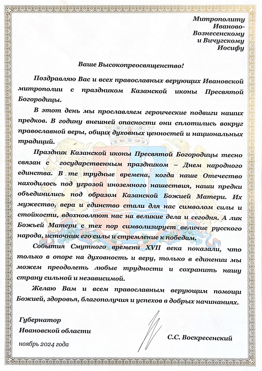 Поздравление губернатора Ивановской области С.С. Воскресенского с праздником Казанской иконы Пресвятой Богородицы и Днем народного единства