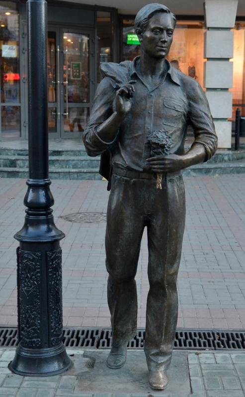 Памятник, мемориал, Саратов, проспект имени Петра Столыпина. 27.09.2021 Он — как будто из песен и фильмов 50-х годов. О таких пели песни и снимали кино. Плечистый и молодой рабочий парнишка, спортсмен и комсомолец — и плакатная советская открытость во всём облике. Нет, поймите правильно: я тоже мог бы стать героем советских плакатов. Правда, карикатурных. Потому как я представляю собой собирательный образ всех тех, кто мешает нам жить — выпивоха и при любом удобном случае лодырь и прогульщик: готов отложить дело ради продукции главспирта! и ради кино тоже! да и выражаюсь складно — почти как черноморский боцман или прораб, у которых собственно практиковался; плохой охранитель государственной и военной тайны; оплату налогов всегда свожу к минимуму, чтоб не распух державный бюджет; находясь за рубежом родной земли мог бы (мог бы! — если что) потерять бдительность, не отвернуться от чужеземных подарков и распахнуть и двери, и окна их крепких телом шпиёнкам! *Тем более, что демократ