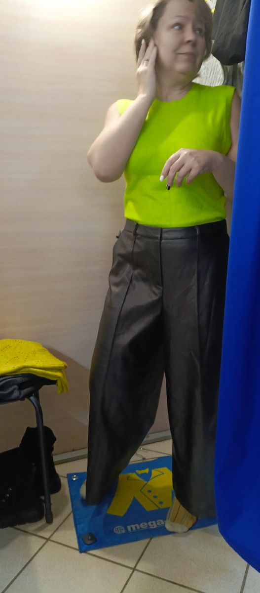 Приветствую всех на своём канале! Сегодня опять про непокупки😏. Покажу вещи, которые мне тоже понравились. В порядке убывания. Обязательно бы эти штаны были бы моими, если бы они были моего размера - Даже несмотря на то, что они не натуральные. Но обалденные и брутальные👍. И ещё очень удобно носить в слякотную погоду, которая сейчас у нас установилась. Влажной салфеткой протёрла, и брюк опять готов для дальнейшей эксплуатации. Но они мне короткие и широкие. Висят на бёдрах, поэтому кажется, что всё в порядке, но если поднять на талию, тогда становятся сильно короткими. Здесь примерила со своими ботинками и свитером. В общем, и ❤️ мужчине они на мне не понравились. И даже девчонки-продавцы отговорили от покупки. В мужском отделе нашла такой кардиган. А заодно решила примерить ещё одни дерматиновые штанишки. Но они мне почти не понравились. Всё, что мне удалось узнать про торговую марку - Далее будет фото-перевод А когда я примерила эти брюки, то поняла, что именно таких ,