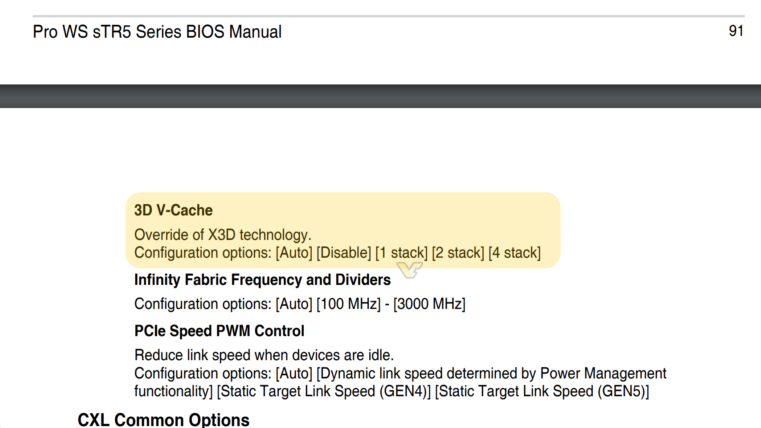 Это может намекать на функции в Threadripper следующего поколения, или это может быть просто неиспользуемая возможность. Официально чипсеты и материнские платы WRX90 не поддерживают процессоры EPYC, что означает техническую несовместимость с процессорами Genoa с 3D V-Cache. Платформа WRX90 разработана специально для серии Threadripper. Ресурс Videocardz.com получил сообщение от читателя, что материнская плата ASUS Pro WS WRX90E-SAGE SE имеет недокументированную настройку, которая в настоящее время не может использоваться для существующих процессоров серий Threadripper 7000WX и 7000X, являющуюся параметром управления для 3D V-Cache. Материнская плата имеет настройку, которая может отключить 3D V-Cache для одного, двух или четырех стеков. Серия Threadripper 7000 доступна в двух конфигурациях корпуса: с 12 CCD или 8 CCD, каждый из которых несет 8 ядер Zen4. EPYC Genoa-X, основанный на архитектуре Zen4 с 3D V-Cache, существует только с 12 CCD и 12 стеками кэша X3D, что добавляет дополнител