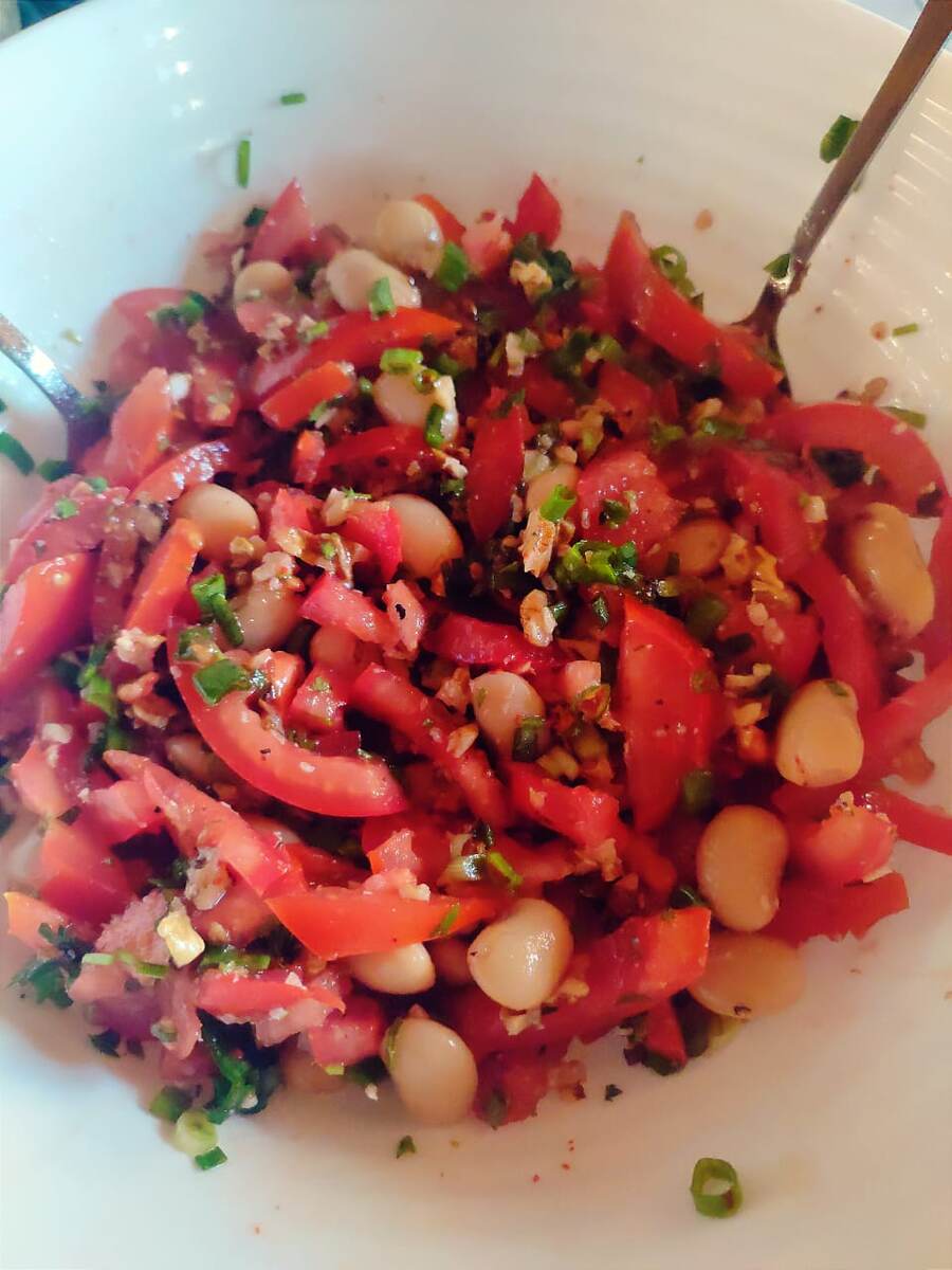 Вегетарианский рецепт Ингредиенты на 2 порции: Приготовление: Если вы используете консервированную фасоль, промойте её под проточной водой и выложите в салатницу. Помидоры вымойте, нарежьте полосками и добавьте к фасоли. Грецкие орехи можно измельчить в блендере или нарезать кухонным ножом. Чеснок пропустите через чеснокодавилку. Зеленый лук и петрушку мелко нарежьте и отправьте к остальным ингредиентам. Затем полейте рапсовым маслом, посолите и поперчите по вкусу. Тщательно перемешайте салат и подавайте к столу. Приятного аппетита!