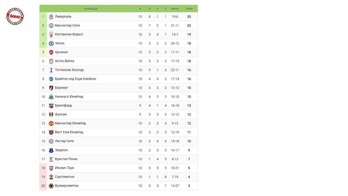 Сегодня вас ждут результаты 10 тура Англии и таблицы других чемпионатов. Швед Исак ошарашил «пушкарей» на 12-й минуте. Как оказалось, это был единственный мяч в игре (1:0 в пользу «сорок»). Как вы знаете, «канониры» за 5 последних игр уступают второй раз – Бормуту и Ньюкаслу. За Борнмут отметились Семеньо и Эванилсон. Давление «горожан» переросло в один гол Йошко Гвардиола (2:1). Первое фиаско Сити в премьер-лиге. Вот накопал интересную историю: в 1999 году эти клубы выступали вместе в первой лиге и сыграли между собой вничью. С тех пор у Манчестера Сити до этого для были одни сплошные победы в очных встречах. Кстати, в том 1999 году «горожане» заняли третье место и прописались в премьер-лигу. Кадыоглу на 14-й открыл счет в составе «чаек». «Красные» ответили в середине второй половины двумя мячами Гакпо и Салаха. Напомню, в текущем году команды сыграли между собой уже в третий раз. «Красные» выиграли все матчи (2:1, 3:2, 2:1). И вновь забивают первыми гости. На 32-й отметился Рождерс.