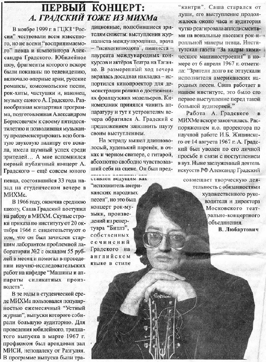 В ноябре 1999 г в ГЦКЗ "Россия" чествовали всем известного, но не всеми "воспринимаемого" певца и композитора Александра Градского. Юбилейное шоу, фрагменты которого вскоре были показаны по телевидению, включало оперные арии, русские романсы, комсомольские песни, рок-хиты, частушки и, наконец, музыку самого А. Градского. Разнообразная концертная программа, подготовленная Александром Борисовичем к своему пятидесятилетию и позволившая музыканту продемонстрировать всю богатую звуковую палитру его вокала, имела шумный успех среди зрителей... А мне вспомнился первый пу6личный концерт А. Градского — ещё совсем юного певца, состоявшийся 33 года назад на студенческом вечере в МИХМе. В 1966 году, окончив среднюю школу, Саша Градский поступил на работу в МИХМ. Скупые строки приказа по институту от 24 октября 1966 г свидетельствуют о том, что он был зачислен старшим лаборантом проблемной лаборатории N2 с окладом 55 рублей в месяц и помогал в проведении научно-исследовательских работ на кафедре "Машины и аппараты силикатных производств". В те годы в студенческой среде МИХМа пользовался популярностью ежемесячный "Устный журнал", выпуски которого собирали большую аудиторию. Для проведения юбилейного, тридцатого выпуска в марте 1967 г профкомом был арендован зал МИСИ, неподалеку от Разгуляя. В программе выпуска были традиционные, полюбившиеся зрителям сюжеты: выступления журналиста-международника, врача-"психогипнолога", пианиста-лауреата международных конкурсов и актёров Театра на Таганке. В размеренный ход вечера вкралась досадная накладка — испортился кинопроектор для демонстрации ролика о достижениях французских модельеров. Киномеханик принялся чинить аппаратуру и тут к устроителям вечера обратился А. Градский с предложением заполнить паузу сваям выступлением. На эстраду вышел длинноволосый, худенький паренёк, в очках н черном свитере, с гитарой, абсолютно свободно чувствовавший себя на сцене. Он был представлен ведущим как ''`исполнитель американских народных песен", но это был концерт рок-музыки, произведении из репертуара "Битлз", собственных сочинский Градского на английском языке в стиле "кантри". Саша старался от души, его выступление продолжалось около часа и аудитория чутко реагировала аплодисментами на вокальные пассажи рок-н-ролльной манеры певца. Институтская газета "За кадры химического машиностроения" в номере от б апреля 1967 г. отметила: "Зрители долго не отпускали исполнителя американских народных песен. Саша работает в нашем институте, это было его первое выступление перед такой большой аудиторией." Работа А. Градского в МИХМе вскоре закончилась. Распоряжением и.о. проректора по научной работе И.Б. Жилинского от 14 августа 1967 г. А. Градский был уволен по его личной просьбе в связи с посryплением в вуз. Ныне заслуженный деятель искусств РФ Александр Градский совмещает творческую деятельность с обязанностями художественного руководителя и директора Московского театрально-концертного объединения.