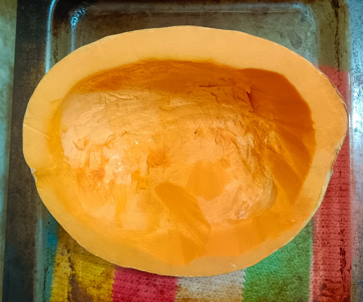 Приближался Хэллоуин, на страницах интернета все чаще мелькали тыквы со страшными рожицами, и я вспомнила, как много лет назад нашла рецепт тыквы, фаршированной говядиной, попыталась приготовить эту блюдо к праздничному столу, но меня постигла неудача - тыква так и не пропеклась за более чем 4 часа в духовке. В итоге гостям пришлось есть говядину без тыквы, а тыкву потом измельчили, засунули обратно в духовку и довели до готовности. И вот я решила повторить опыт, надеясь, что в этот раз все получится. Приобрела половинку тыквы размером примерно 35х25 см, с относительно тонкими стенками. Изначально думала, что мне придется повозиться с разделкой овоща, но, к моему счастью, он был уже разрезан и очищен. И как будто специально создан для фаршировки. В соответствии с рецептом, который я нашла в интернете, тыкву внутри нужно было смазать медом, посолить и поперчить, так я и сделала. Отдельно поджарила, а потом протушила говядину с луком и специями (специи можно брать любые). Говядину нареза