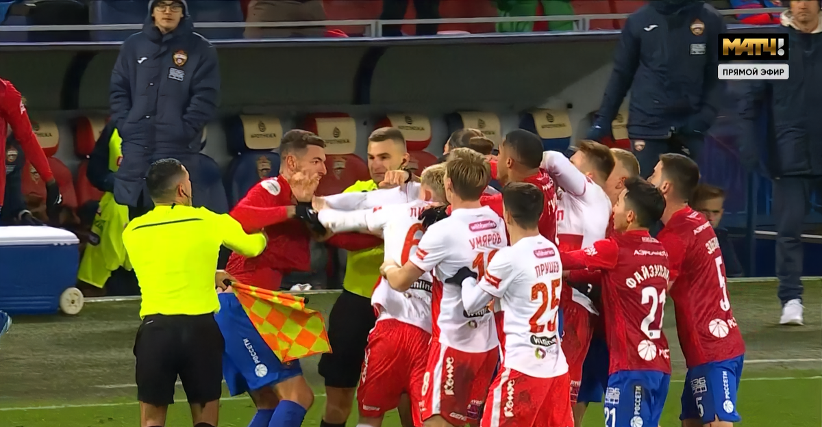 Начнем по порядку. Само действо случилось на исходе первой десятиминутки второго тайма: 1.Матвей Кисляк грубо въезжает в спартаковца Барко и тот улетает за пределы поля. 2. Фол Роши на Угальде, и понеслось… Умяров не выдерживает и начинает что-то высказывать Виллиану, но это длится буквально считанные секунды, потому как следом начинается чуть ли не файтинг в который мы все играли в детстве под названием Мортал комбат. Умяров и Роша чуть ли не разбивают друг другу лица, хватают за всевозможные части тела, следом влетает Серджан Бабич, хватает за шею двумя руками армейского бразильца и начинается откровенная куча -мала. Там уже и Литвинов, и Пруцев, и Гуарирапа, и Рябчук вытворяют то , чего мы очень давно не видели на футбольном поле, повторяюсь - просто Мортал комбат. Люди, которые пытались растащить игроков, на какие-то, опять же, секунды справлялись со своей задачей - но ненадолго. Умяров и Роша вновь нашли друг друга и продолжили махач с небывалой до сели силой. Вы должны понимать,