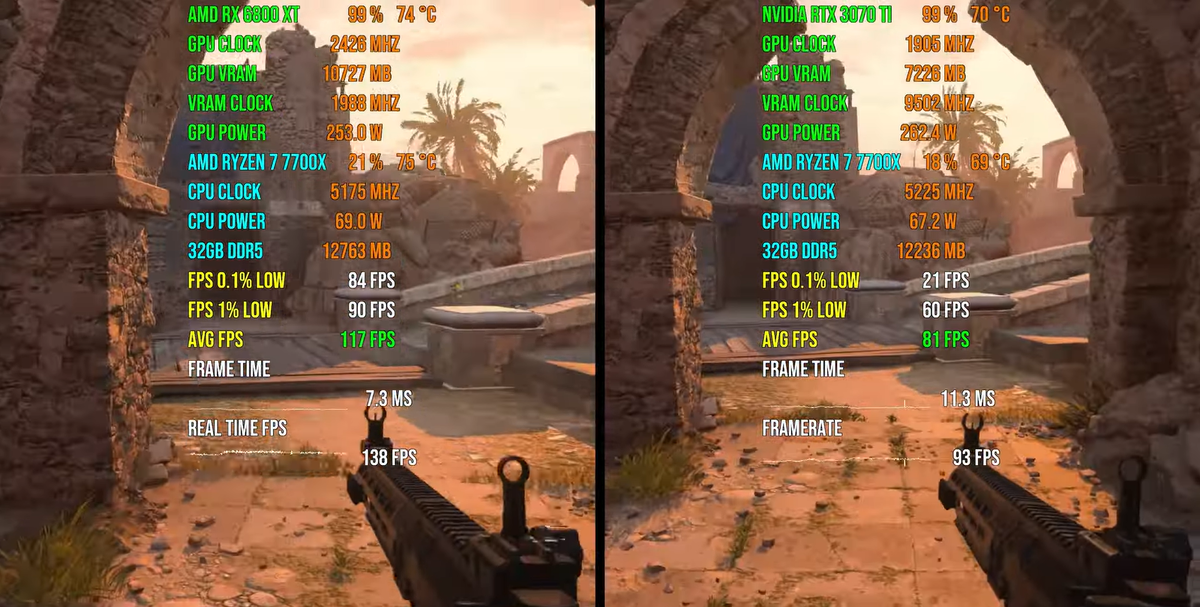 В одном из выпусков на YouTube-канале GPU Tester узнали, насколько велика разница между RX 6800 XT и RTX 3070 Ti. Тестировались они в играх в 1440p. God of War Ragnarök шла с ультра-графикой. В среднем в этой игре удалось получить 86 к/с (6800 XT) и 81 к/с (3070 Ti). Warhammer 40K Space Marine 2 запускалась с высоким пресетом. Средний FPS здесь равнялся 91 к/с (6800 XT) и 60 к/с (3070 Ti). Black Myth Wukong тестировалась на настройках графики Cinematic. Средняя частота кадров в ней составляла 46 к/с (RX 6800 XT) и 43 к/с (RTX 3070 Ti). В игре The Last of Us с пресетом Ultra в среднем частота кадров равнялась 74 к/с (6800 ХТ) и 42 к/с (3070 Ti). Starfield шла с графикой Custom (Ultra). Средняя производительность в ней составляла 70 к/с (6800 XT) и 53 к/с (3070 Ti). Star Wars Jedi: Survivor запускалась с высоким пресето. Средний FPS в этой игре находился в районе 76 к/с (6800 ХТ) и 63 к/с (3070 Ti). A Plague Tale Requiem тестировалась с ультра-графикой. В среднем частота кадров в этой иг