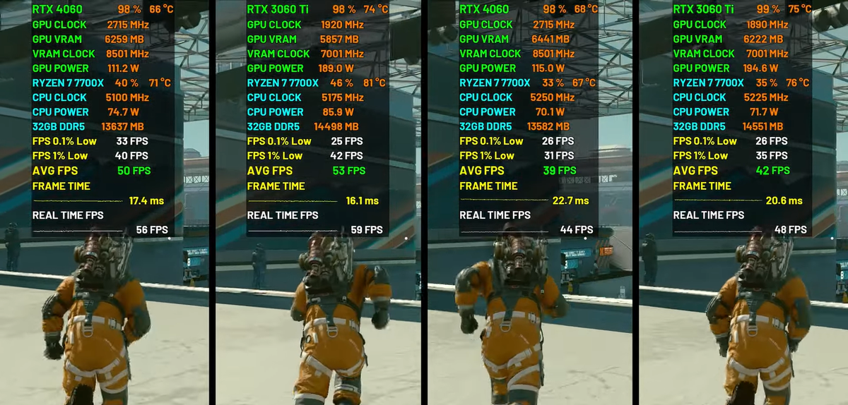 На YouTube-канале GPU Tester видеокарты RTX 4060 и 3060 Ti запустили в играх в 1080p и в 1440p. God of War Ragnarök запускалась с ультра-графикой. В среднем в этой игре производительность составляла в 1080p — 76 и 85 к/с (4060 и 3060 Ti соответственно), в 1440p — 57 и 65 к/с соответственно. Warhammer 40K Space Marine 2 тестировалась с высоким пресетом. Средний FPS здесь равнялся в Full HD — 65 к/с (4060) и 70 к/с (3060 Ti), в 2К — 42 и 47 к/с соответственно. Black Myth Wukong шла с DLSS и графикой Cinematic. Средняя частота кадров в ней составляла в 1080p — 39 к/с и 40 к/с (с 4060 и 3060 Ti), в 1440p — 34 и 35 к/с соответственно. В игре The Last of Us с ультра-пресетом средняя производительность находилась в 1080p на уровне 48 к/с (4060) и 52 к/с (3060 Ti), в 1440p равнялась 31 и 34 к/с соответственно. Starfield тестировалась с пресетом Custom (Ultra). Средний FPS в этой игре в Full HD равнялся 51 к/с (4060) и 54 к/с (3060 Ti), в 2К — 40 и 43 к/с соответственно. В игре Call of Duty: Mo