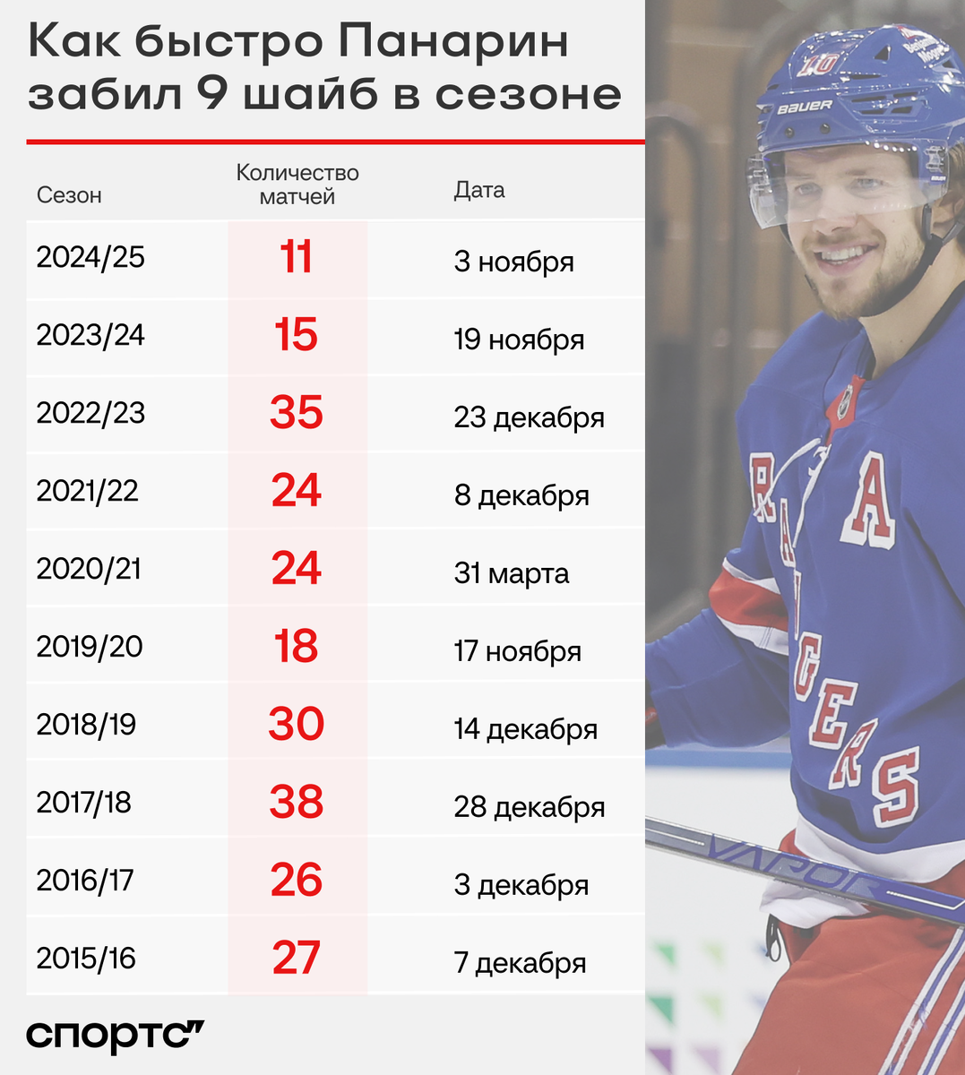Артемий Панарин продолжает яркий старт сезона-2024/25. За 11 матчей у нападающего «Рейнджерс» забросил уже 9 шайб. Так быстро Панарин еще никогда не доходил до этой отметки. В прошлой регулярке на это понадобилось 15 игр.