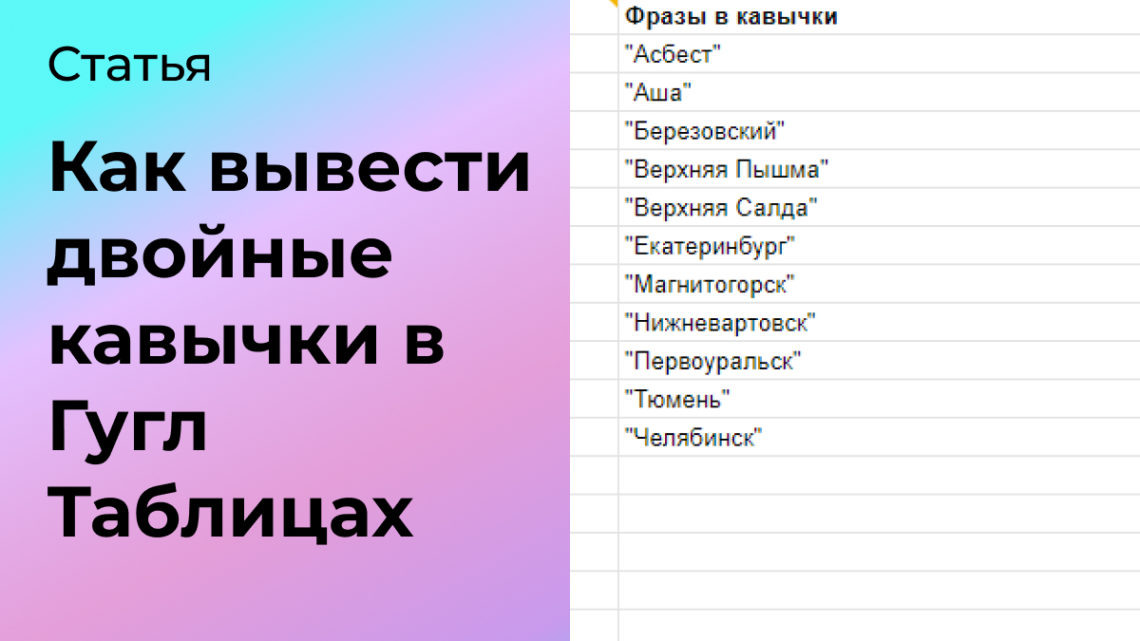 Разные типы вхождения ключевых слов способны влиять на эффективность рекламных объявлений и их охват. При этом проставлять типы вхождений вручную очень долго. Найти удобные инструменты для постановки, например, кавычек, не так уже и просто. Для себя я нашел формулу, которая помогает в несколько кликов добавить разные типы вхождений в документ. Ей и поделюсь в статье. Особенно актуально, когда нужно СЦЕПИТЬ (CONCATENATE) текст или текст в кавычках. Для примера есть список из 2-х элементов: Анапа, Адлер. Необходимо вывести текст: “Анапа”, “Адлер”. Вариант 1: используем сцепку. = CONCATENATE(“”””Анапа””””;””””;””””Адлер””””). Вариант 2. Ещё можно сделать так: = CONCATENATE(char(34),”Анапа”,char(34)&char(34),”Адлер”,char(34)). Вариант 3. Чтобы добавить двойные кавычки и разделительную точку с запятой используем формулу: = SUBSTITUTE(Ячейка с текстом,char(34)&char(34),char(34)&";"&char(34)). А больше полезных материалов можно найти в моём блоге. В нём я регулярно делюсь бесплатными шаблонам