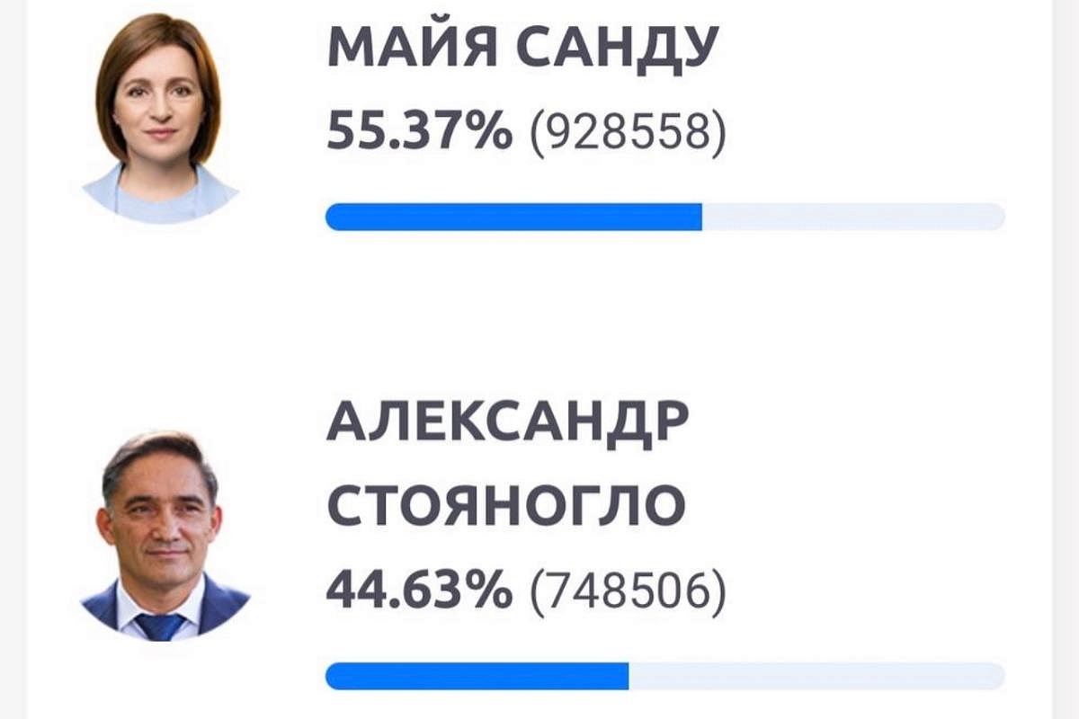 Майя Санду лидирует во втором туре выборов президента Молдавии с результатом 55,37% Действующая президент Молдавии Майя Санду выходит в лидеры по результатам второго тура президентских выборов, набрав 55,37% голосов. Её соперник, бывший генеральный прокурор Александр Стояногло, получил 44,63% голосов. Эти данные обнародовала Центральная избирательная комиссия (ЦИК) после обработки 99,77% бюллетеней.