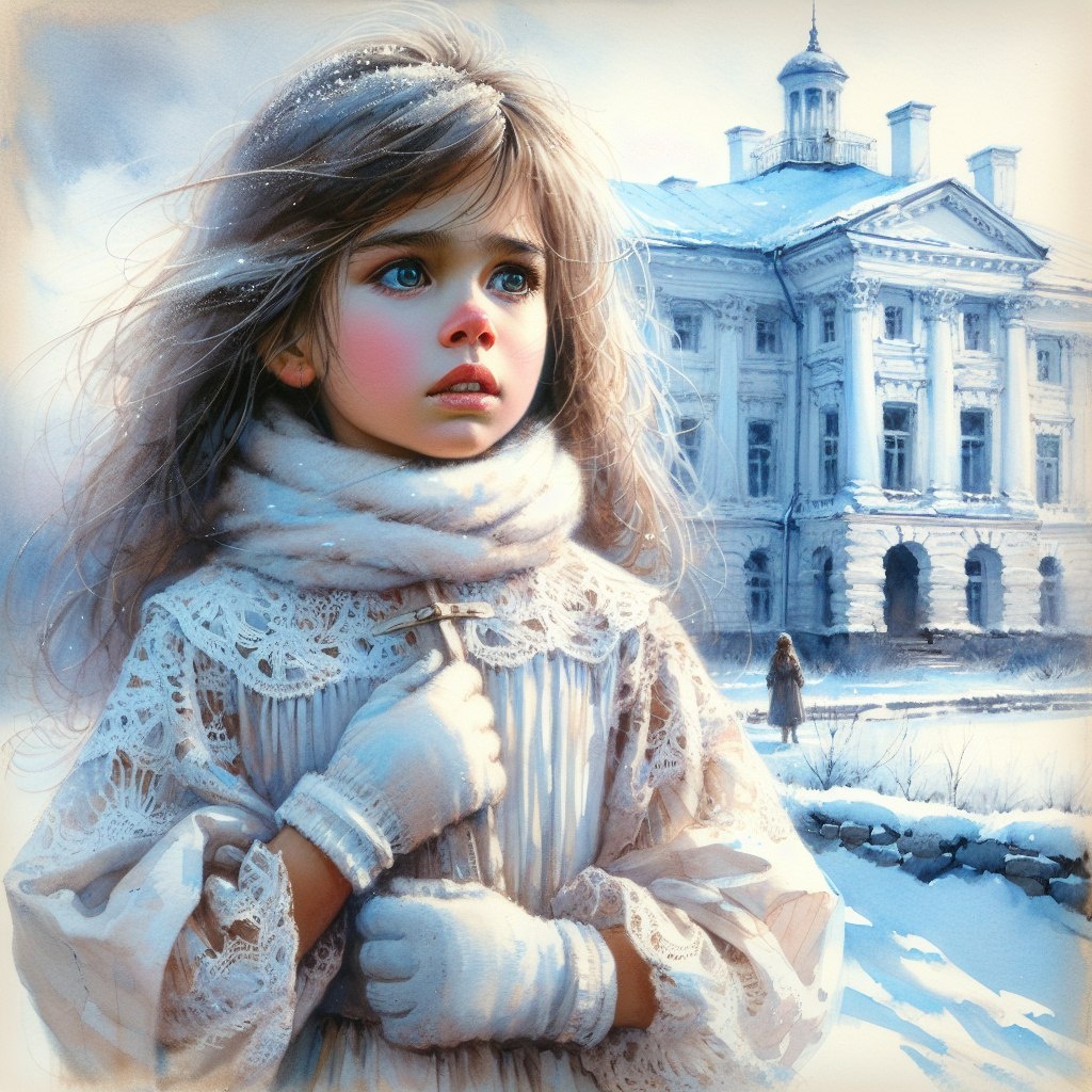 Я вижу, что эта девочка стоит босиком на снегу в белом красивом платье с кружевами.