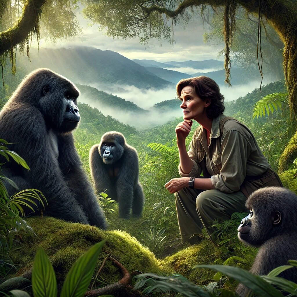 Дайан Фосси — легендарная американская зоолог и антрополог, посвятившая свою жизнь защите горных горилл от браконьеров в горах Руанды. Её бесстрашие, самоотверженность и преданность своим подопечным сделали её настоящим символом борьбы за выживание редких видов. Несмотря на угрозы и опасности, Фосси до самого конца боролась за права этих животных, став одним из самых известных борцов за сохранение дикой природы. Дайан Фосси с детства любила животных и мечтала о карьере, связанной с природой. В 1963 году во время поездки в Африку она впервые увидела горных горилл и сразу же влюбилась в этих уникальных животных. Это путешествие изменило её жизнь: она осознала, что эти существа, так похожие на людей, находятся под угрозой исчезновения из-за браконьерства и уничтожения их среды обитания. После этого Фосси решила вернуться в Африку и посвятить свою жизнь изучению и защите горилл. Она поселилась в горах Вирунга, основав исследовательский центр Карисоке, и начала изучать жизнь и поведение гор