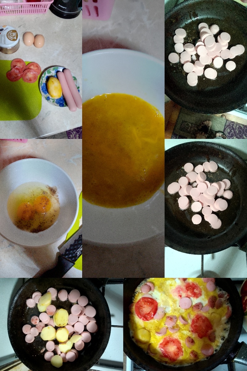 Для приготовления яичницы я беру две сосиски🌭🌭🌭, у меня была одна вареная картошка, четыре дольки помидор (у меня замороженные), два яица и растительное масло. Яица разбиваем в миску, солим и перчим. Всё хорошо перемешиваем. Сосиски и картофель нарезаем и обжариваем на растительном масле. Сверху выливаем яица и выкладываем помидор. Накрываем сковородку крышкой и жарим до готовности.