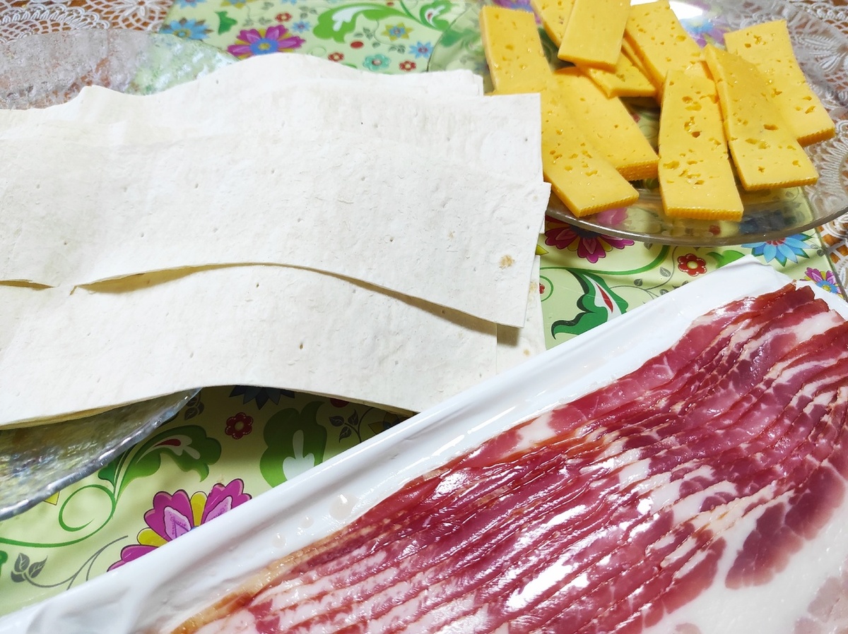 Когда надоедают привычные блюда, когда начинаю задаваться вопросом: чтобы такого вкусненького приготовить- открываю фудблоги. Наперебой выскакивают самые вкусные, которые все ищут, которые готовят каждый день, которые спрашивают соседи, рецепты. Вот и сейчас мой взгляд примагнитил рецепт вкусной и быстрой закуски из бекона и лаваша. Особенно слово "быстрой". Меня даже меньше интересует вкусная или нет. Главное- меньше затратить время на приготовление. Минимальный набор продуктов: лаваш, бекон, сыр, кунжут. Для соуса: сметана, укроп, чеснок. Лаваш режем на полоски, такой же ширины, как купленный в магазине бекон. Сначала кладём полоску бекона, на него- лаваш, и пластинку сыра. Заворачиваем в рулетик. Насаживаем на шпажку рулетики. Посыпаем кунжутом. Отправляем в духовку, разогретую до 180 градусов, на 20 минут. Как только сыр начнёт вытекать- рулетики готовы. Пока они готовились, я делала соус. Сметана, естественно, деревенская. Согласна, что магазинная не такая жирная, и лучше использо