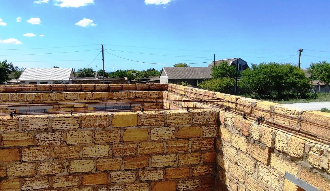 Для надёжной перевязки между собой всех стен и создания основы для крепления перекрытия и крыши надо залить бетонный армопояс поверх стен. Первый вопрос, который необходимо решить ,- толщина армопояса. Наружные стены в один камень – 38 см. Можно залить его на всю толщину стен. Но есть ли в этом необходимость? Достаточным будет сечение 20 см на 20 см. Работа разделилась на этапы. 1. Был выложен ещё один ложковый ряд по наружным стенам. Этот ряд будет как бы наружной частью опалубки при заливке армопояса. 2.Вязание арматурного каркаса армопояса, установка шпилек для крепления мауэрлата, установка опалубки. Это, пожалуй, самая длительная и нудная работа, на которую (работая по выходным) ушло два месяца. Опалубку собирали на саморезах, далее доски 25х100 были использованы для обрешетника на крыше. 3.Заливка бетона в опалубку- физически тяжелая работа. Одному работать не получится. Кто-то должен замешивать бетон и подавать его вверх, а кто-то должен его укладывать, вибрировать и выравниват
