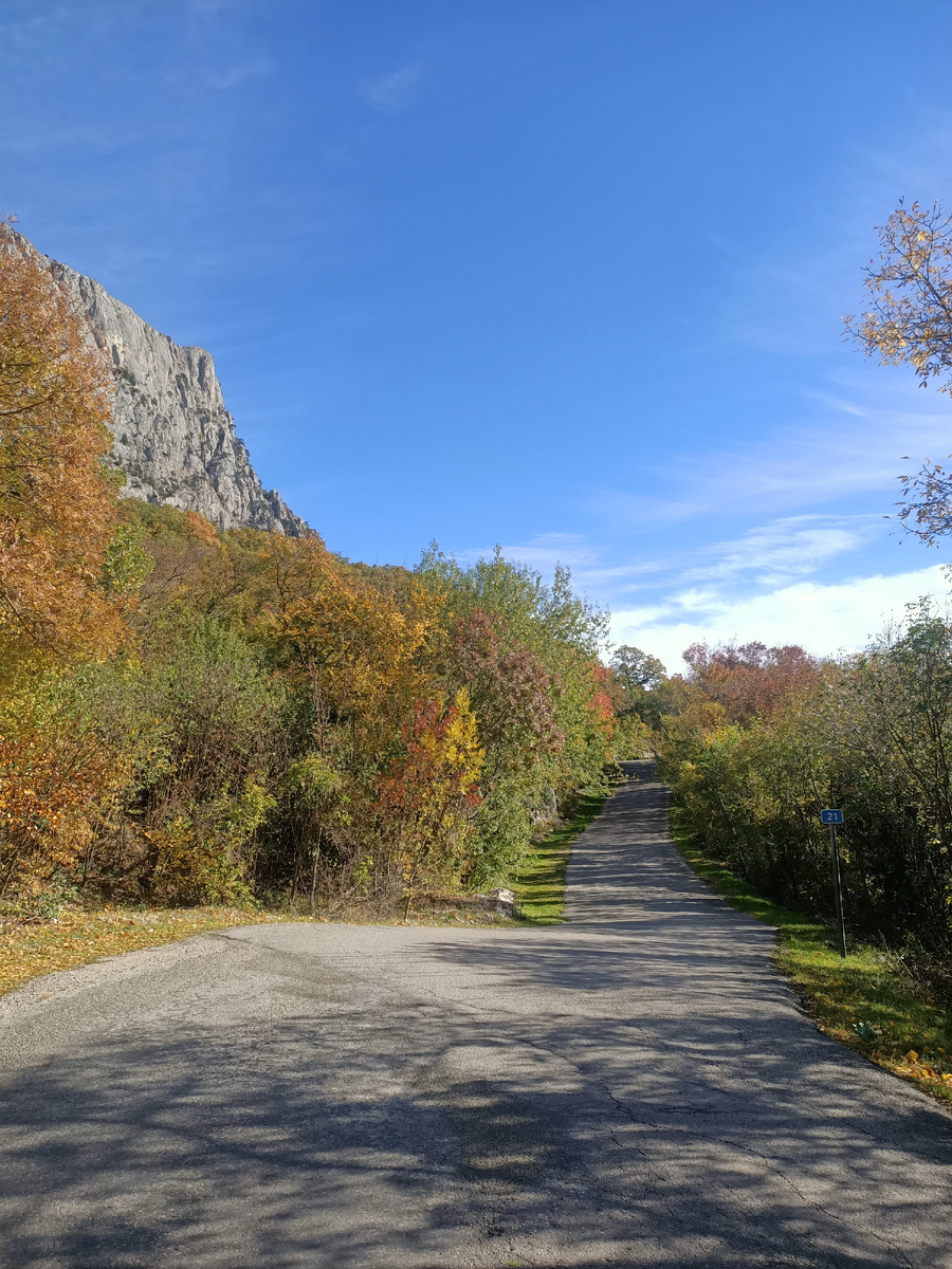 Удивительная дорога прямо под горами была заставлена автомобилями. Весь Крым рванул в возможно последний солнечный ещё немного тёплый день осени кто за грибами, кто прогуляться по заповеднику. Из леса постоянно кто-то появлялся с полными вёдрами или наоборот исчезал в ярком цветном осеннем лесу.