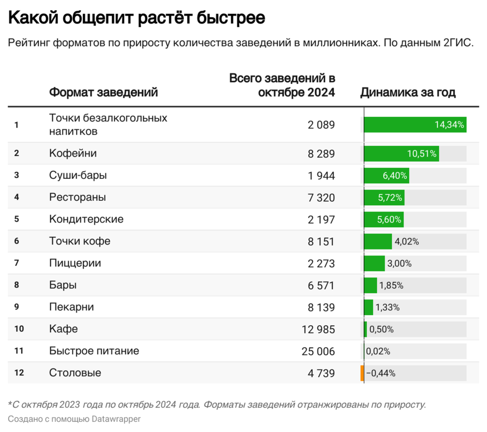 За последний год Нижний Новгород стал единственным городом-миллионником РФ, где точек безалкогольных напитков стало меньше — количество таких общепитов сократилось на 9%, до 49 точек. Об этом говорится в исследовании 2ГИС. В тройку самых быстрорастущих сегментов общественного питания в городе вошли: Интересно, что в целом в крупных городах России количество столовых сокращается, а в Нижнем Новгороде такой формат продолжает оставаться востребованным, — говорится в сообщении. В целом по РФ с октября 2023 г. наибольший рост числа новых заведений продемонстрировали три сегмента общественного питания: точки безалкогольных напитков (на 14%),кофейни (на 11%) и суши-бары (на 6%). Авторы исследования также отмечают активный рост числа фреш-баров по стране. Тенденцию объясняют трендом на здоровый образ жизни и относительно невысокой стоимостью запуска таких точек. Как недавно писал NN.DK.RU, летом 2024 г. нижегородцы обогнали по потреблению алкоголя жителей Санкт-Петербурга.