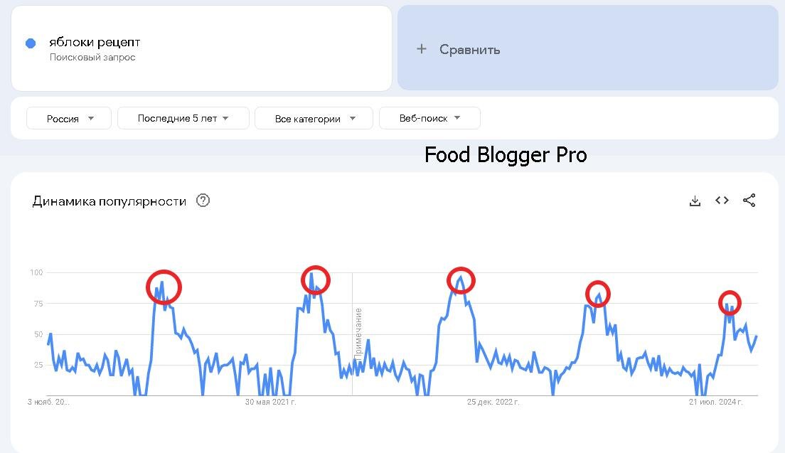 Анализируй какие рецепты снимать именно так и собирай тысячи просмотров! Создание кулинарного контента — это не только про умение готовить, но и понимание, какие продукты и в какое время года будут актуальны для вашей аудитории. Используя инструмент Google Trends, вы можете заранее спрогнозировать, какие рецепты стоит готовить, чтобы они пользовались высоким спросом, показатели канала росли, а вы получали свое вознаграждение как автор контента. Рассмотрим, как вы можете использовать Google Trends для анализа популярности определённых продуктов. Например, у вас есть предчувствие, что в июне рецепты с яблоками будут в моде. 1. Поиск и анализ: Зайдите в Google Trends и введите запрос «Яблоки рецепты». 2. Настройка параметров: Установите временной интервал на последние 5 лет и выберите страну — Россия. 3. Изучение данных: После нажатия кнопки поиска, внимательно изучите график. Ищите пики активности и закономерности (пример отмечен на скриншоте красным). Например, вы можете заметить, что