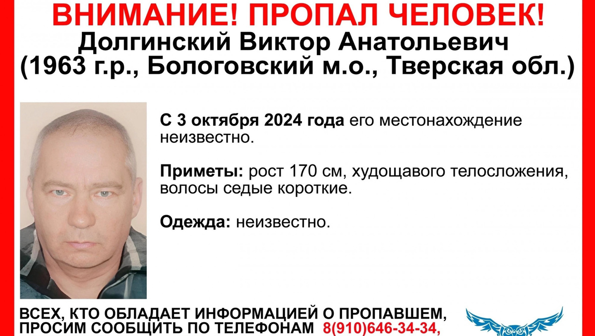В Бологовском районе Тверской области пропал 61-летний Виктор Анатольевич Долгинский. Как сообщает тверской волонтерский поисково-спасательный отряд "Сова", с 3 октября 2024 года местонахождение мужчины неизвестно. Приметы: рост 170 см, худощавого телосложения, волосы седые короткие. Одежда: неизвестно. Всех, кто обладает информацией о пропавшем, волонтеры просят позвонить в отряд по телефонам: 8 (910) 646-34-34, 8 (904) 014-12-34