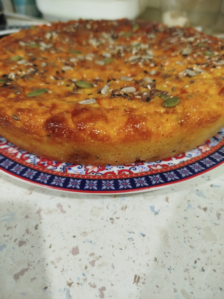 Дорогие друзья , я уже писала много раз про блюда из тыквы . Даже собрала их в одну статью. Читать тут Но вот вчера попробовала ещё один рецепт по рекомендации моей тети. Язык отьешь!!! Очень вкусно получилось. Буду делать ещё. Делюсь с вами. 200 г мякоти тыквы без шкурки трем на мелкую тёрку 2 яйца( 3 если мелкие) взбиваем с 1/2 стакана сахара 300 г творога( я брала две пачки по 180 г ) добавляем в смесь, солим немного. Я добавила гость изюма и горсть семян. 3-4 столовых ложки манки добавляем, все перемешиваем и сразу перекладываем в форму и ставим выпекать в разогретую духовку . Не нужно ждать, чтобы манка набухла - будет жёсткая масса Я добавила на всякий случай пакетик разрыхлителя, хоть муки и нет в рецепте. На всякий случай . Форму брала силиконовую, смазала растительным маслом и немного дно присыпала манкой. Выпекать 30 минут при 180 градусах Верх я ничем не смазывала, а корочка получилась красивая глянцевая. Немного сверху просто семечками присыпала. Я их очень люблю, доба