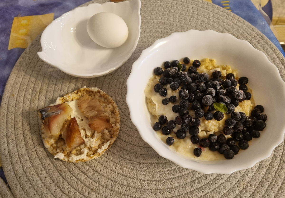 На завтрак опять была овсянка с черникой, вареное "иичко" и бутер с творожным сыром и с/с скумбрией.