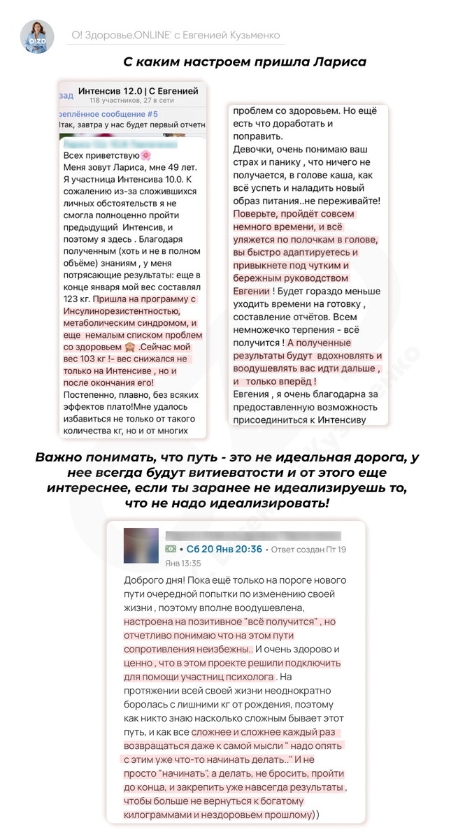 Расскажу вам историю Ларисы – в фактах, цифрах, а самое главное – про взаимосвязь нашего здоровья и внешнего вида с тем, что происходит в нашей жизни. Лариса принимала участие в 10-м потоке интенсива, но в связи со сложившимися ситуациями в жизни полноценнцю работу пришлось прервать и продолжить уже в 12-м потоке. Здоровье, а по факту то, как мы себя чувствуем, может либо давать силы, либо их отнимать. Наш внешний вид заставляет нас «прятаться» или идти вперед с ощущением полной уверенности в себе. Когда у женщины есть лишний вес, ей не надо говорить: «Надо похудеть!» Она и так сама это знает, но не может справиться с этим по разным причинам. И это не значит, что она безвольная и любит много поесть. Это значит, что еда в её случае закрывает «потребности», которые возникли в её теле. Когда мы находимся в состоянии нарушения углеводного обмена и дефицита гормонов щитовидной железы – это говорит о том, что наши клетки находятся в энергодефиците. Отсюда и выстраивается наше пищевое поведен
