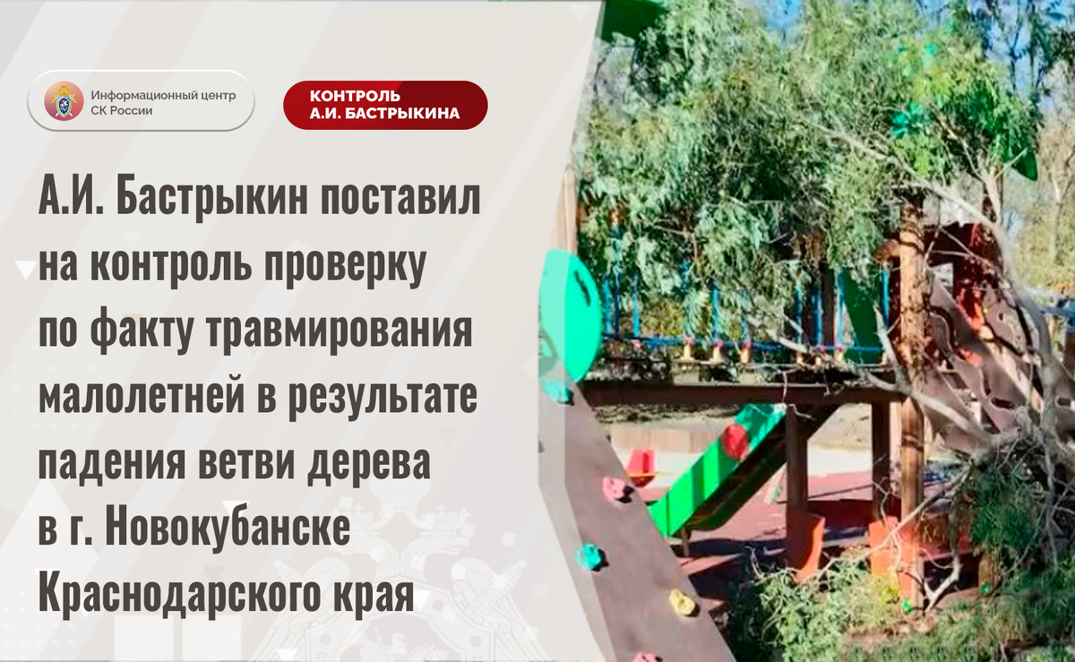 А.И. Бастрыкин поставил на контроль проверку по факту травмирования малолетней в результате падения ветви дерева в г. Новокубанске Краснодарского края В социальной сети сообщается, что 2 ноября текущего года в городе Новокубанске Краснодарского края на восьмилетнюю девочку, находившуюся на детской площадке, упала ветвь дерева. Пострадавшая госпитализирована с многочисленными ушибами и переломом ключицы. В СУ СК России по Краснодарскому краю по данному факту организована процессуальная проверка. Председатель Следственного комитета Российской Федерации Александр Иванович Бастрыкин поставил ход процессуальной проверки на контроль в центральном аппарате ведомства и поручил руководителю СУ СК России по Краснодарскому краю Андрею Константиновичу Маслову представить доклад о ее промежуточных результатах и принятом по итогам решении. #СледственныйКомитет #СКРоссии #СКР #ИЦСКР #Информационныйцентр #АлександрБастрыкин #ПредседательСКР #КонтрольПредседателяСКР #КомментарийКонтроль #Краснодарский