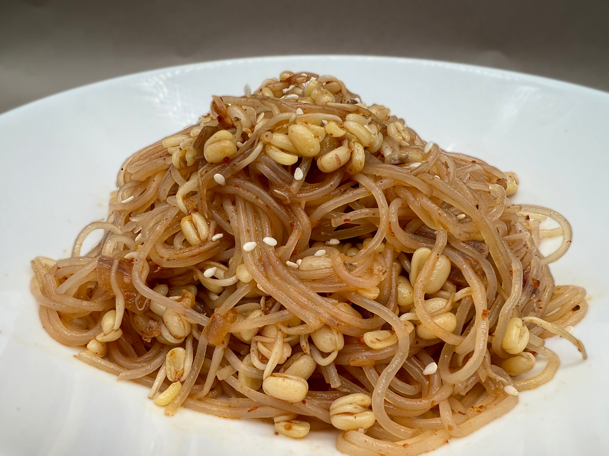 Мне не очень нравятся “ростки”. Я старалась добавлять их в салаты и сэндвичи, но по-настоящему не понимала их привлекательности. На вкус они слишком...ну... ростки. Но я посмотрела дораму "Итхэвон класс" и поняла, что на самом деле ем ростки неправильно. Обжаривать их, как это делали в одной из серий, вкусно и просто. В наших магазинах ростки бобов мунг продаются под названием "проростки фасоли" или "маш". Маш также можно купить сухим и прорастить самостоятельно. Наверно, что-то подобное можно сделать и с проростками других растений. Количество: 2 порции Сложность: Легко Инструкция: 1. Замочите фунчозу в большой миске в кипятке, пока вы будете чистить проростки от шелухи. 2. Откиньте лапшу на дуршлаг и промывайте ее холодной водой, пока она не перестанет быть слишком горячей на ощупь. Отложите лапшу в сторону. 3. В сковороде разогрейте оливковое масло и 1 столовую ложку кунжутного масла на среднем огне. Когда масло разогреется, добавьте лук и чеснок и обжаривайте, пока лук не станет