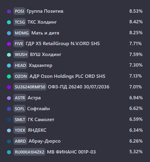 Динамика значений по сравнению с Индексом МосБиржи: • С начала года по открытым позициям +2.66% • За последние три месяца +3.35% Продолжаю в рамкам долгосрочной стратегии подбирать в портфель акции компаний, которые на долгой дистанции должны показать более ярко выраженный рост по сравнению с нашим индексом. При высокой ставке нам и бизнесу компаний придеться жить, как минимум до середины следующего года, а значит возможность для наращивания доли в акциях еще предостаточно. Все публичные стратегии стараюсь ежемесячно пополнять на 20 тыс. Структура портфеля: • Акции 87.7% • Облигации 12.3% Стоит напомнить, что изначально портфель был собран в начале текущего года на 350 тыс. рублей Главная ребалансировка случилась в момент, когда индекс пробил восходящий канал. Было принято решение зафиксировать прибыль в отдельных акциях, пока не будет ясности на рынке. Спустя время, я в полной мере осознал насколько это было верным решением. ✅️ Сейчас в портфеле 12 компаний: • Яндекс $Y