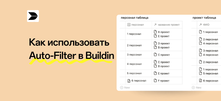 Для того чтобы помочь компаниям и частным лицам удобнее и эффективнее отслеживать прогресс проектов, в конце сентября Buildin.AI(Buildin) запустила функцию Auto-Filter. Это расширенная функция фильтрации, которая может быть немного сложной для обычных пользователей. В этой статье мы на конкретных примерах объясним, что такое Auto-Filter и как его использовать, чтобы помочь всем лучше понять Auto-Filter. Во-первых, Auto-Filter — это функция, позволяющая двум многомерным таблицам, связанным с помощью связь, автоматически фильтровать и связываться, избавляя от сложностей ручного связывания. Поэтому перед тем, как продемонстрировать примеры использования Auto-Filter, давайте посмотрим на проблемы, связанные с ручным связыванием в связь, с которыми мы сталкиваемся в повседневной жизни. Предположим, есть команда, в которой несколько человек, каждый из которых отвечает за разные проекты. Мы создадим две многомерные таблицы: первую назовем персонал таблица, вторую — проект таблица. Эти две таб