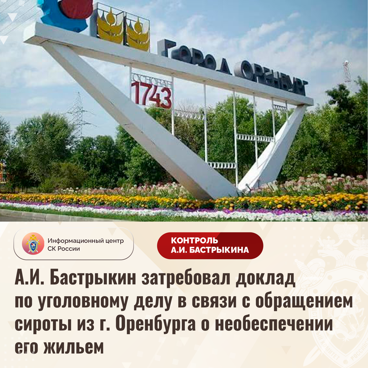 А.И. Бастрыкин затребовал доклад по уголовному делу в связи с обращением сироты из г. Оренбурга о необеспечении его жильем