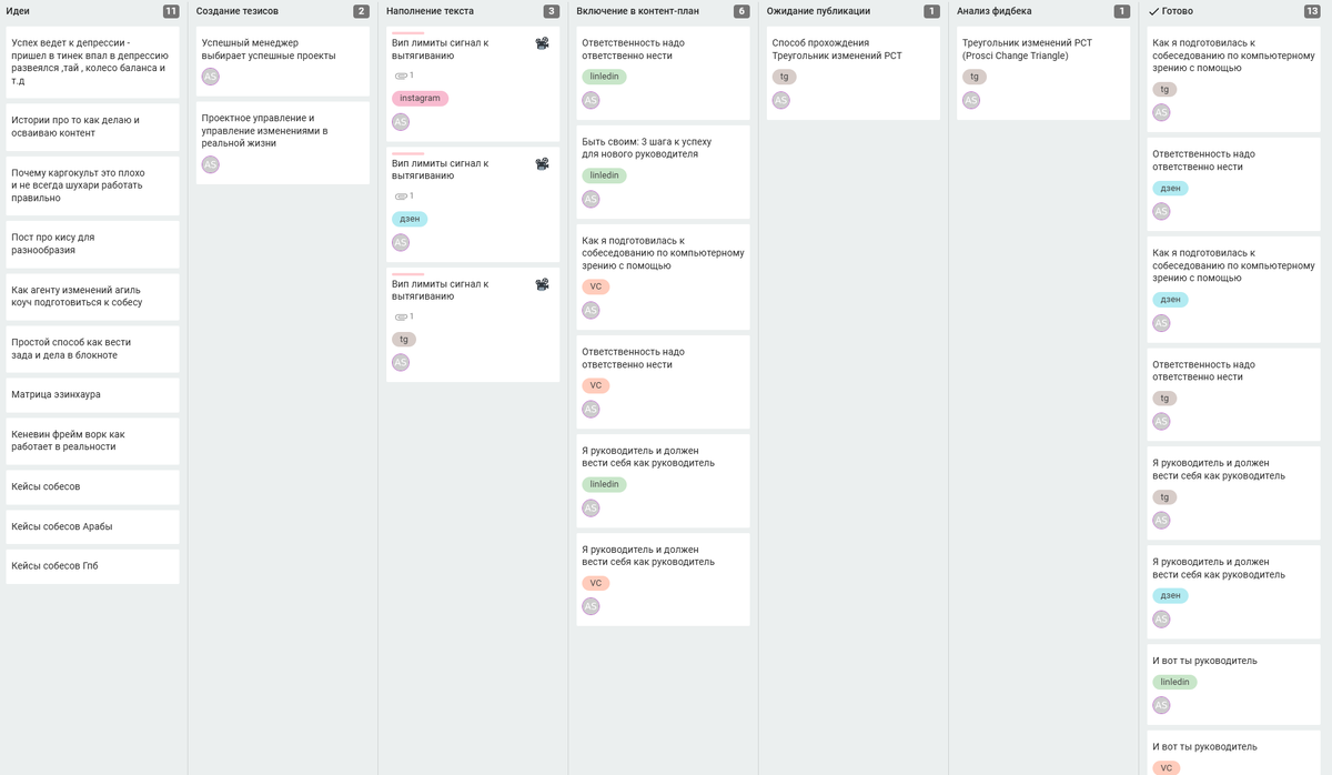 - Представьте рабочий процесс в виде последовательных этапов. Например, мой процесс создания материалов для блога выглядит так: Идея -> Создание тезисов -> Наполнение текста - > Включение в контент-план - > Ожидание публикации - > Анализ фидбека