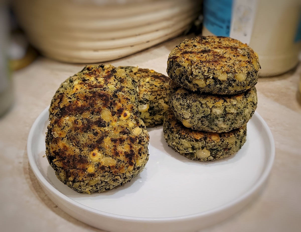 Соединить горох (с оставшеися водои) с мукой гречки и сушеными водорослями