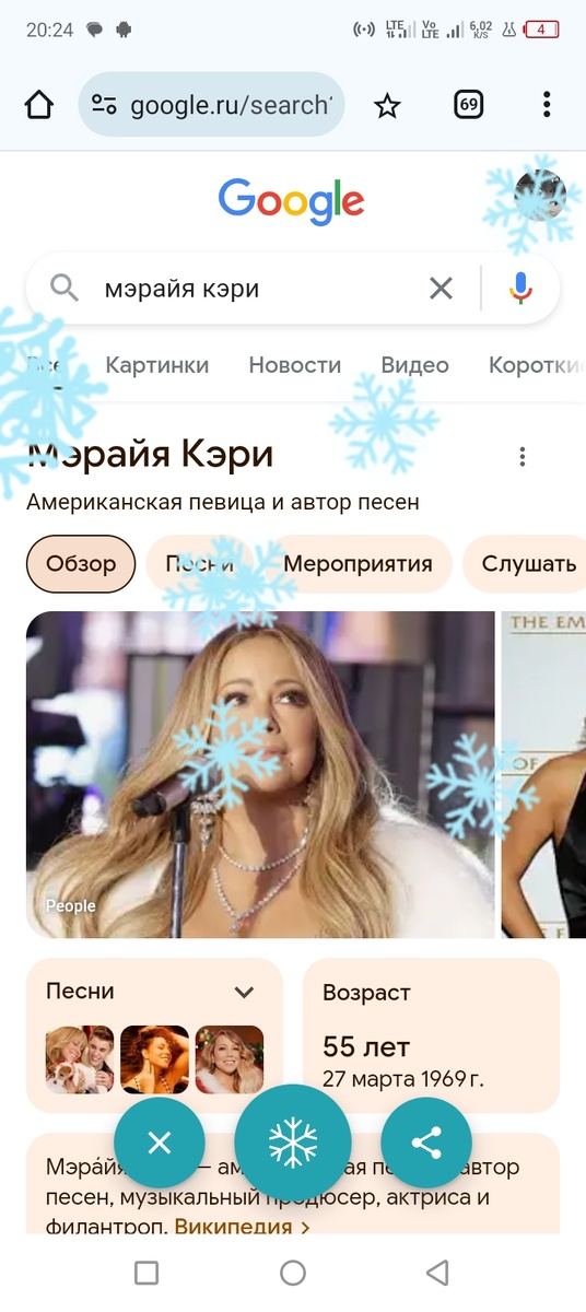 ❄До Нового года и Рождества еще много времени, но чудеса уже начали происходить!❄ Например, недавно в моем ноутбуке пошел снег! ❄И всё из-за певицы Мэрайи Кэри. ❄Откройте поисковую строку Гугл и наберите Мэрайя Кэри, нажмите кнопку поиск и на вашем экране появятся снежинки. ❄Их будет не очень много.❄ Но внизу есть кнопочка, на которой нарисована большая снежинка. Нажимайте на неё и снежинок будет становиться все больше и больше. Лично я устроила настоящий снегопад. Это так весело! Я играла несколько раз подряд. Очень забавно. Запускать снежинки можно и в компьютерной версии и в мобильной. Главное, искать через поиск Гугл. Кто же придумал такое развлечение - появление снежинок при поиске Мэрайи Кэри? Неизвестно. Я искала и там и сям, но это тайна, покрытая мраком. Зато есть догадки, почему такого эффекта удостоилась именно Мэрайя Кэри. Очевидно, все дело в ее песне All I Want for Christmas Is You, которая стала гимном Рождества. "Всё, что я хочу на Рождество, - это ты!" Песня была выпущ