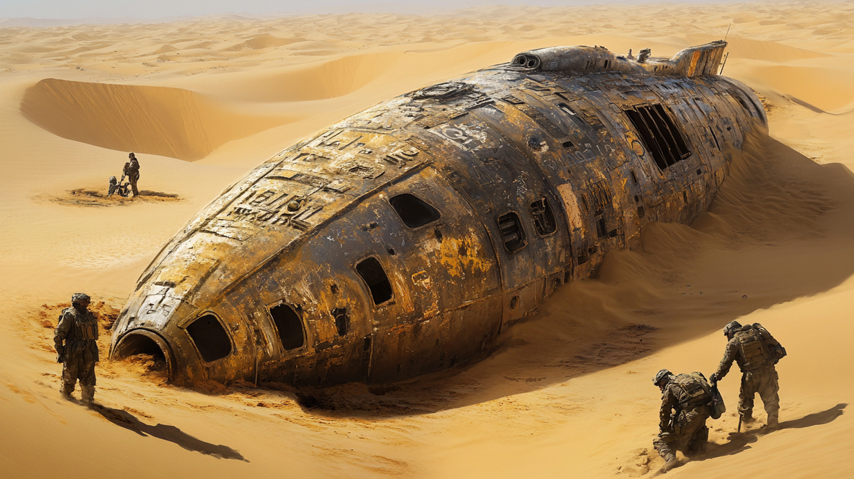 По словам археолога, участвовавшего в раскопках, их команда первоначально подумала, что обнаружила древний космический корабль. Это были захватывающие моменты — под светом ночных фонарей они увидели часть металлического корпуса, уходящего глубоко в пески. Не дожидаясь рассвета, археологи связались с международными спецслужбами и специалистами по аномалиям. На следующее утро в пустыню прилетели чёрные вертолёты, из которых вышли люди в защитных костюмах. Местных рабочих и исследователей быстро разогнали, а всех специалистов под угрозой неразглашения отправили в ближайший город. Однако один из археологов успел сделать несколько фотографий, которые впоследствии появились в сети.