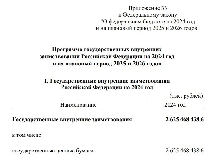Итак, согласно изначально закрепленной законом программе государственных внутренних заимствований на 2024 год, Минфин планировал привлечь в этом году 2,625 трлн рублей через размещения новых выпусков ОФЗ.