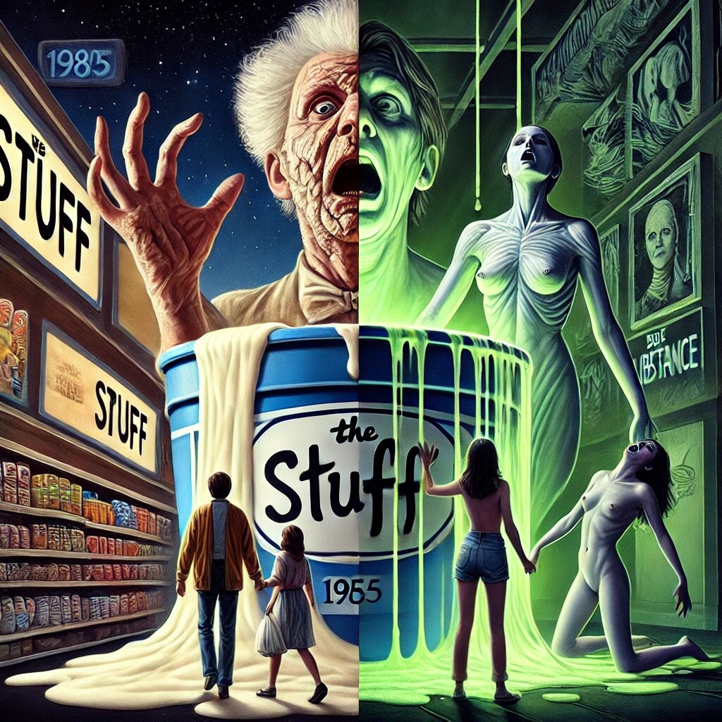 «Субстанция» 1985 и 2024 годов — это два фильма, которые используют один и тот же символ для отражения разных проблем общества. В 1985 году Ларри Коэн создал сатиру на культуру потребления, подчёркивая опасности слепого следования за трендами и модой. В 2024 году Корали Фаржа создала более личный, боди-хоррор, фокусируясь на внутренних переживаниях и социальном давлении, которое испытывают женщины в современном мире.