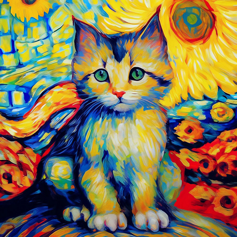 Эта генерация была первой. Я скормила нейросети запрос "Котенок будто рисовал Ван Гог". Она выдала изображение котенка и, в общем-то, похоже на стиль Ван Гога. Картинка послужила вдохновением для целой серии. Котенок на картине Ван Гога. Отлично получилось. Вполне можно использовать для оформления какого-нибудь общественного пространства, например, кафе. Котенок в стиле Пикассо. Следующий тоже, хотя отличается кардинально. Котенок в стиле Кандинского. Хорошая генерация, мне очень нравится. Котенок в стиле Малевича. Я думала, будет черный квадрат с глазами))))) Стало интересно, как выглядит котенок в стиле Петрова-Водкина. Самая известная работа художника, пожалуй, "Купание красного коня". В данном случае получилось "Сидение красного кота". Котенок в стиле Сальвадора Дали. Каких ее художников с ярким, уникальным и узнаваемым стилем вы знаете? Котенок в стиле Кусамы. И следующий тоже. Часто обращаюсь к творчеству японской художницы, я уже делала генерации комнат и интерьера с ее знаменит