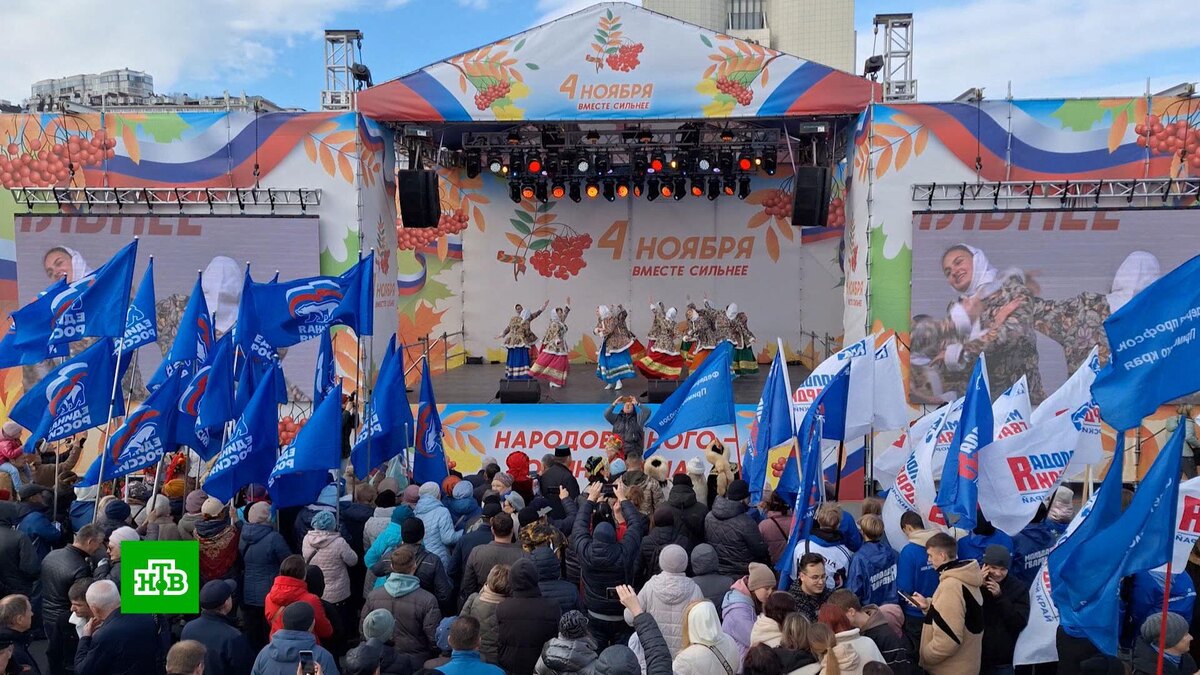 [ Смотреть видео на сайте НТВ ] Гуляния и шествия в День народного единства проходят по всей стране. Первыми праздник встретили жители Приморья. На центральной площади Владивостока состоялся концерт с участием коллективов из разных регионов страны. Там же расположились ярмарка мастеров, этнофудкорт и выставка оружия и военной экипировки. Массовые торжества состоялись и в Сибири. В Красноярске народные гуляния прошли под девизом «Мы — единое целое». Житель Красноярска: «Если в народе не будет единения, то не будет и страны. Мы сильны только в этом единстве». Житель Красноярска: «Пришли концерт посмотреть, отдохнуть, провести время хорошо, выходной день. Мы тут родились, мы планируем жить, растить детей. Как не любить Родину». В программе были различные культурные мероприятия с фокусом на прошлое, например, устроили игру в городки и мастер-класс по историческому фехтованию. В Москве в Музее Победы сегодня прошел необычный флешмоб — показ национальных костюмов народов России. Помимо дефил