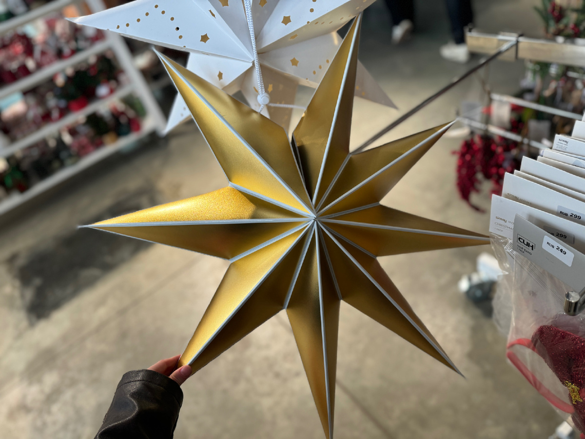 В ноябре в магазинах начинаются появляться новогодние коллекции. А это значит, что я начинаю делать обзоры для вас. Будем смотреть и отделы для дома, и, конечно же, наряды. Ноябрь обещает быть насыщенным. Итак, сегодня мы с вами отправляемся с бывший Sinsay и нынешний СИН. Здесь всегда находится что-то интересное для дома, жаль, возить новое стали менее активно. Самое главное, не терять голову. В этой всей атмосфере может показаться, что надо всё. Я не буду вас агитировать покупать всё, нет, я еще отговорю от нескольких позиций 😁 Хочу начать с очень симпатичных звезд, которыми можно украсить дом. Мне нравится такое, хотя у меня ничего похожего не было. Я бы поверила 2 звезды рядом. Одна золотая (оцените, у них довольно большой размер), другая белая. Вместе смотрятся хорошо. Цена такой звезды по нынешним меркам весьма лояльная — 399 рублей. Хранить будет удобно, они складываются. Еще из декора есть рождественские венки. Но я, наверное, отдала бы предпочтение натуральным. Если у вас