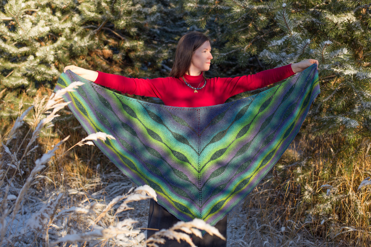 Позапрошлой зимой я уже вязала шаль про Северное сияние, в первом её варианте сочетая цветную Дундагу с однотонной. Шаль тогда получилась красивая, но с тех пор меня не покидала идея сделать всё-таки отсылку не только к цветовой гамме Авроры, но и к звёздному небу, добавив пайеток или бисера. (Про предыдущую "Аврору" можно прочитать по ссылке ниже).